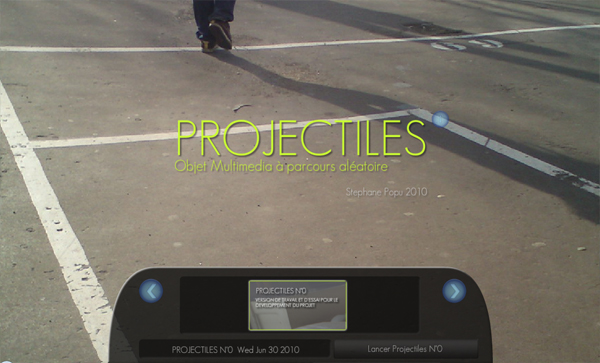 Projectile est un diaporama multimédia en ligne structuré en plusieurs chapitres. Chacun de ces chapitres diffuse environ 10 images choisies de manière semi-aléatoire dans une base de données.
